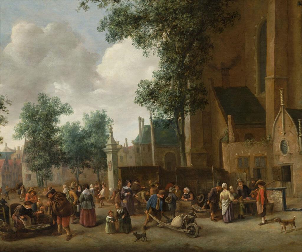 Via de Schoolstraat bereik je de Grote Markt, destijds de Nieuwe Groenmarkt. Groenten en fruit werden hier verhandeld, aangevoerd per schuit via de nieuw gegraven grachten. Het Boterhuis vormde het centrum van handel en toezicht en huisvestte het schilders- en apothekersgilde. Het St. Lucasgilde bood kunstenaars als Jan van Goyen en Jan Steen een platform om hun opleiding, opdrachten en netwerken uit te bouwen. De markt toont het levendige samenspel van sociale lagen: regenten, drukkers, metselaars, winkeliers, klerken, boeren en armen. Op de groente- en fruitmarkt komen ze elkaar tegen.