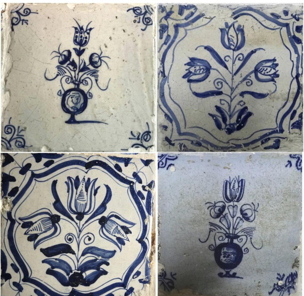 Ook in de tegeltableaus zijn tulpen en ook een kievitsbloem verwerkt. Er zijn een aantal aardewerken tegels met tinglazuur die een drietulp in vaas voorstellen, compleet met tulpenbol.