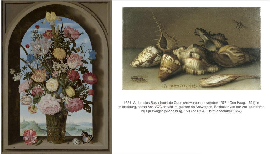 Het is dan ook niet zo gek dat de eersten die het bloemstilleven als genre ontwikkelen zich in Middelburg bevinden. Het zijn Ambrosius Bosschaert de Oude (Antwerpen, november 1573 – Den Haag, 1621) en zijn zwager, die bij hem studeerde, Balthasar van der Ast (Middelburg, 1593 of 1594 – Delft, december 1657).