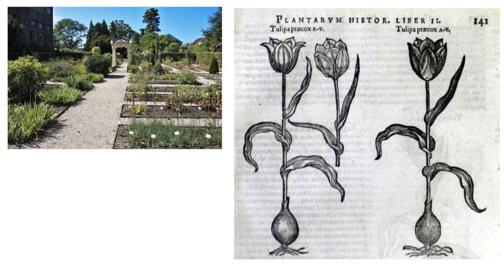 Als je een bezoek brengt, kom je vanaf het Rapenburg meteen bij een besloten tuin tussen diverse gebouwen. Het is een reconstructie van de besloten tuin van de directeur Carolus Clusius (1526-1609). Hij kwam vanuit Wenen naar Leiden en was hier rond de eeuwwisseling de eerste directeur van de botanische tuin (1594). Hij kweekte hier meer dan zeshonderd tulpen. Het was de eerste grote tulpencollectie in Europa. Hij kreeg bollen van andere wetenschappers.