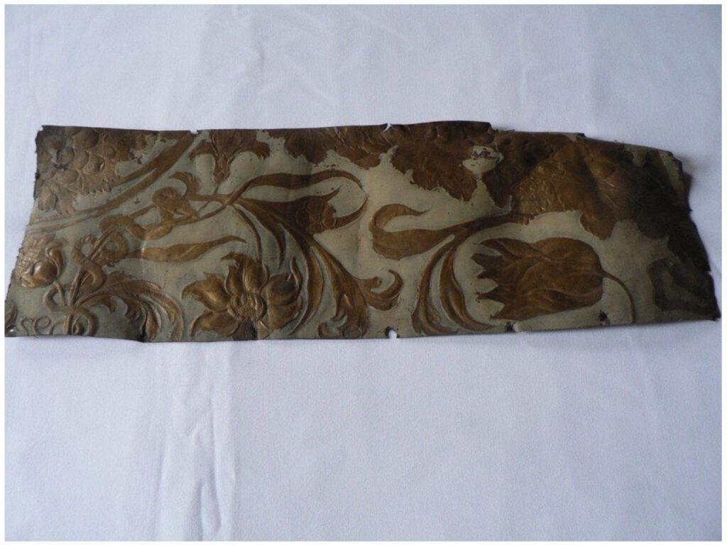 Bij de restauratie in 1976 kwamen er stukken goudleer tevoorschijn.