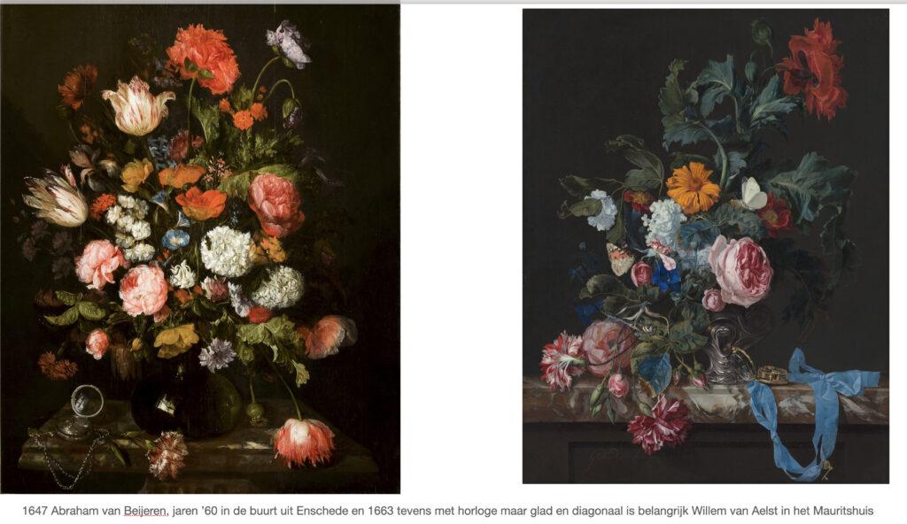 Er werd dan ook gebruik gemaakt van tekeningen en voorstudies en aan de hand daarvan kwamen schilderijen tot stand. Tegenwoordig kunnen we deze bloemen allemaal wel tegelijkertijd bloeiend in een vaas zetten, vanwege de internationale handel en de kassen die dit mogelijk maken, maar vroeger was dit echt onmogelijk.